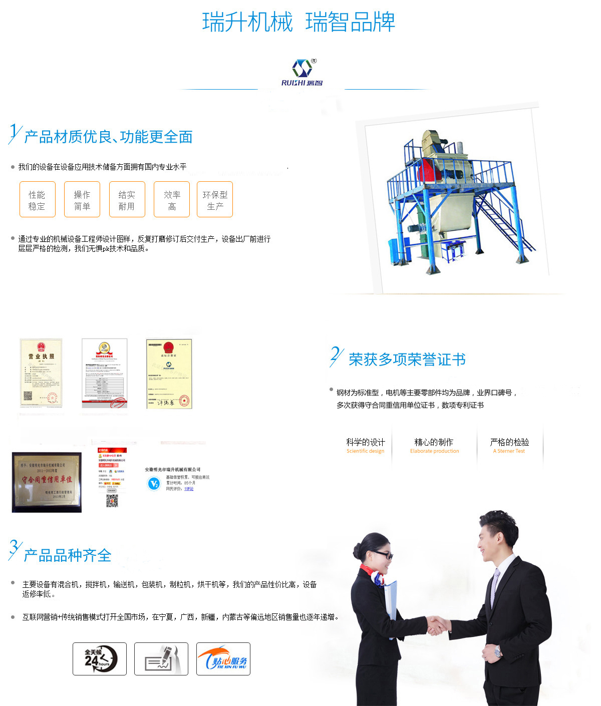 安徽瑞升機械制造有限公司坐落在明光市工業(yè)園區(qū),本公司產(chǎn)品主要用于粉料物質(zhì),顆粒物質(zhì)的混合、攪拌、輸送、包裝的自動化生產(chǎn)設(shè)備。工廠占地面積為1萬多平方現(xiàn)有6000平方米的生產(chǎn)車間和各類加工檢測設(shè)備,具備產(chǎn)品開發(fā)、研制、設(shè)計、生產(chǎn)、試驗、倉儲運輸?shù)饶芰Γ梢陨a(chǎn)多種規(guī)格、多種非標定制的產(chǎn)品,并有多項技術(shù)獲得國家專利,擁有自主進出口權(quán),公司憑借優(yōu)良的技術(shù)、先進的工藝和科學的管理理念,所生產(chǎn)的產(chǎn)品已暢銷全國各地,部分產(chǎn)品已進入馬耳他、印度尼西亞、韓國、羅馬尼亞、沙特阿拉伯、馬來西亞、印度、巴基斯坦、等國家和地區(qū),受到國內(nèi)外客戶的高度認可和信賴。 本公司獲得守合同重信用單位證書,對原材料的采購極為細致,鋼材為標準型,電機等主要零部件均為品牌,數(shù)項專利證書。技術(shù)方面我司擁有一支國內(nèi)的技術(shù)和管理團隊,在機械設(shè)備應(yīng)用...公司資質(zhì)榮譽